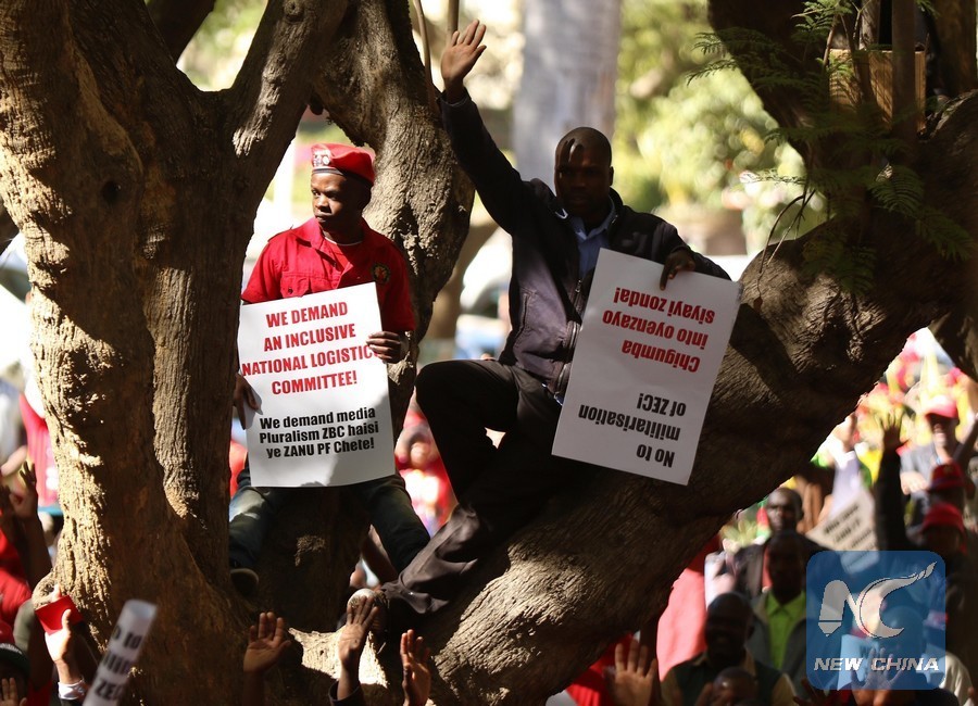 Supporters of Zimbabwe's opposition Movement for Democratic Change (MDC) Alliance hold posters during a demonstration for electoral reforms, in Harare, capital of Zimbabwe, July 11, 2018. MDC Alliance on Wednesday staged another demonstration in the capital Harare to demand key electoral reforms ahead of the July 30 vote. (Xinhua/Shaun Jusa)