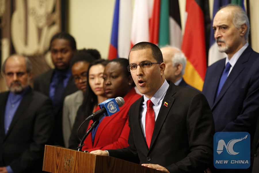 Venezuelan Foreign Minister Jorge Arreaza (Front) speaks to reporters at the United Nations headquarters in New York, on Feb. 14, 2019. (Xinhua/Li Muzi)