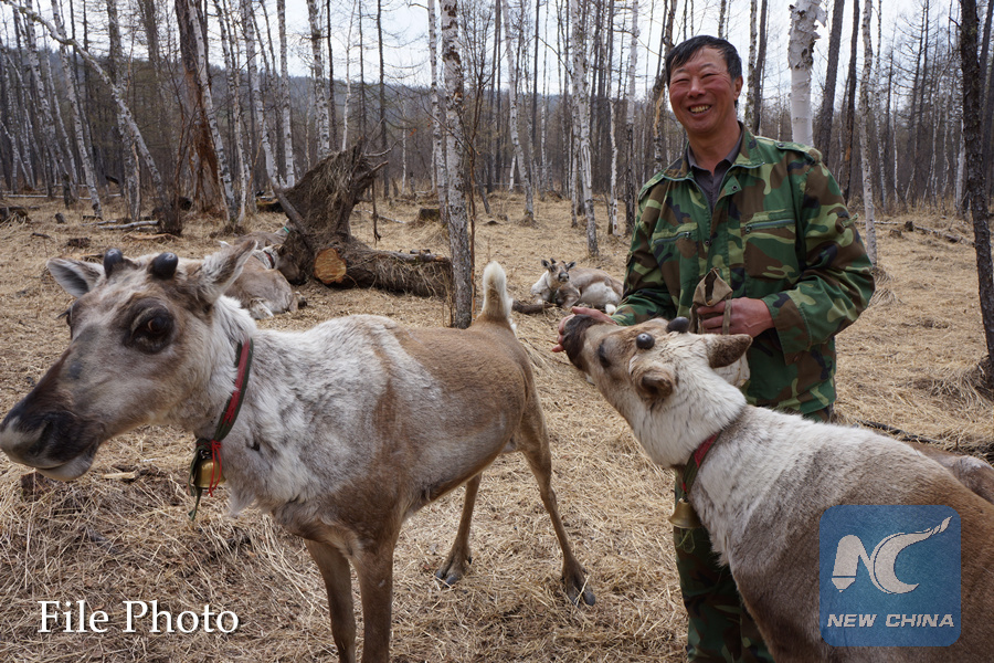 Reindeers fed by Ewenki people are seen at a farm in Aoluguya town of Genhe City, north China's Inner Mongolia Autonomous Region, May 9, 2014. (Xinhua/Zou Jianpu)