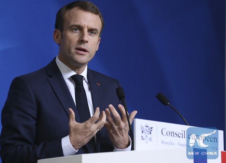 French President Emmanuel Macron speaks during a press conference at the end of an EU Summit in Brussels, Belgium, on Dec. 14, 2018. (Xinhua/Ye Pingfan)