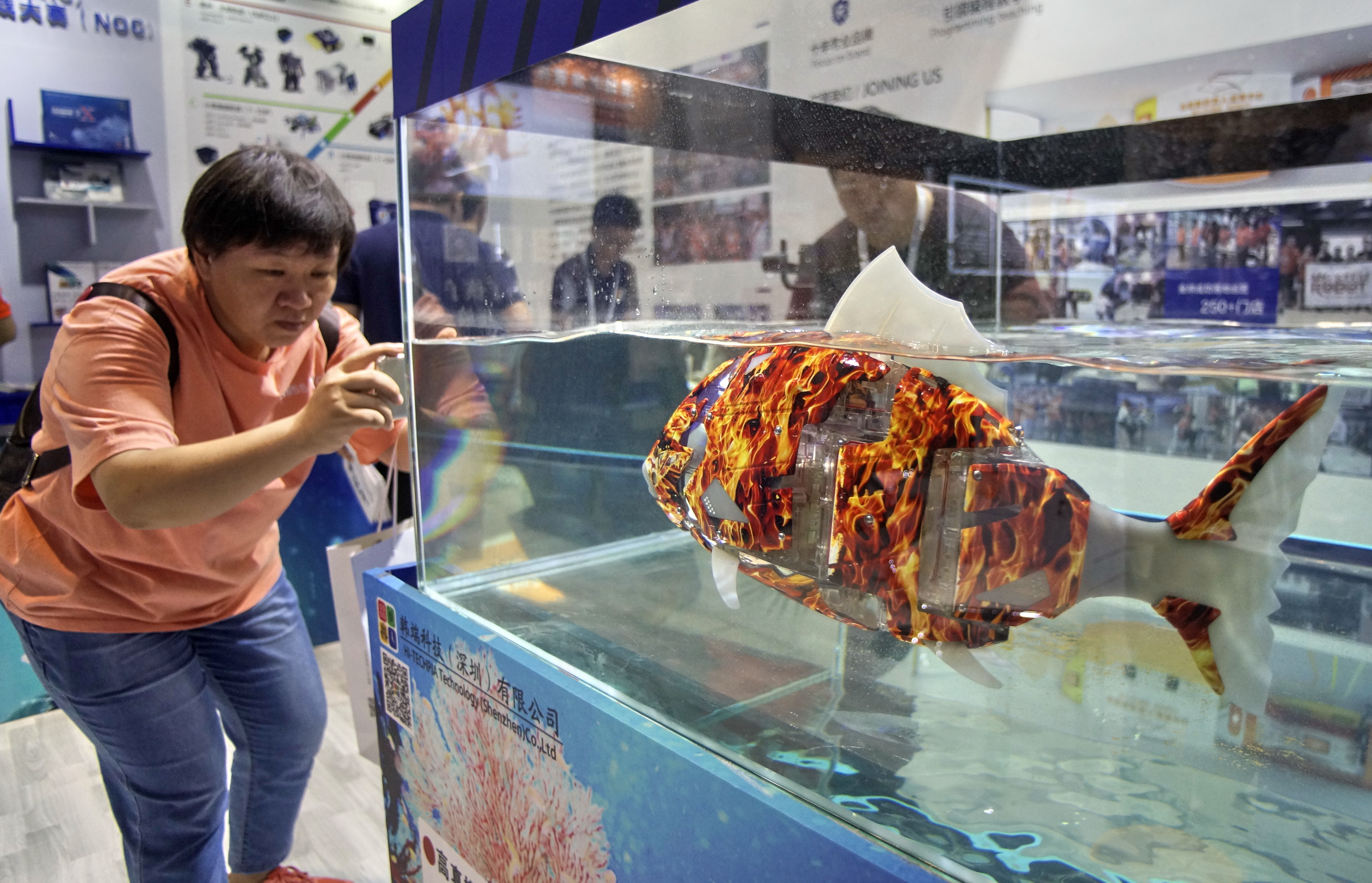 A visitor takes photos of a bionic robot fish during the 2019 World Robot Conference in Daxing District of Beijing, capital of China, Aug. 20, 2019. (Xinhua/Li Xin)