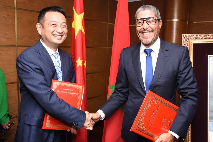 A co-marketing partnership is signed by Adel El Fakir, Moroccan National Tourist Office's general director, and James Liang, executive chairman of Ctrip, in Rabat, Morocco on Sept. 6, 2019. (Chadi/Xinhua)