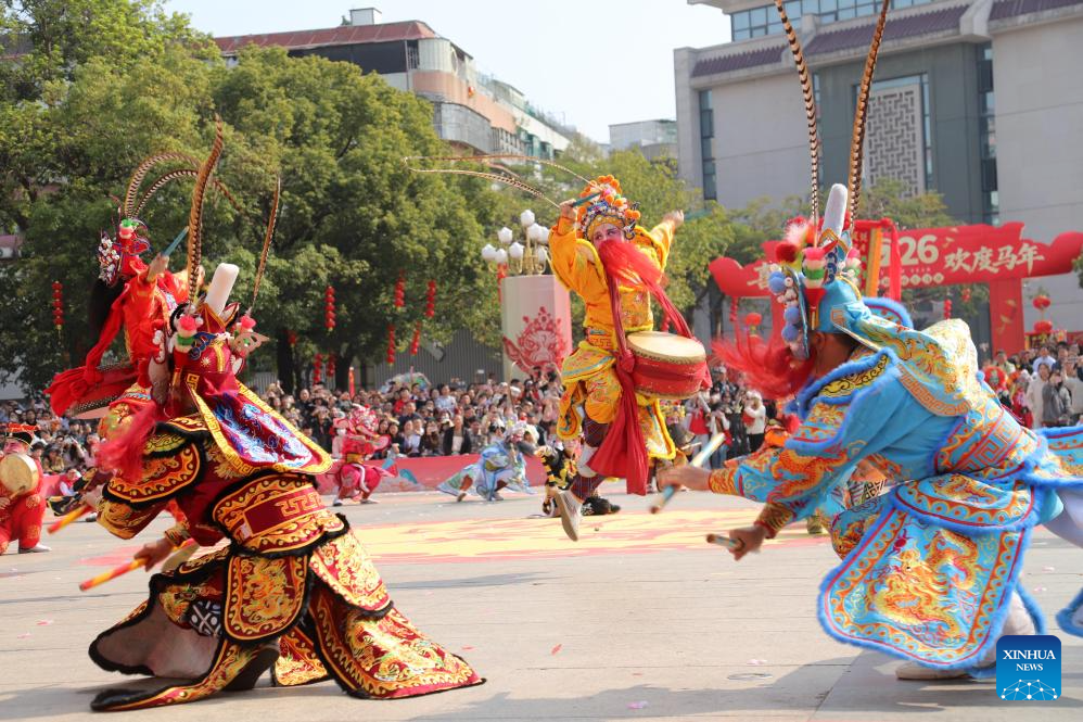 Artists perform during a Yingge dance carnival event celebrating the Spring Festival in Chaoyang District of Shantou, south China's Guangdong Province, Feb. 21, 2026. During the Spring Festival holiday, many Yingge dance teams have staged wonderful performances across China.
