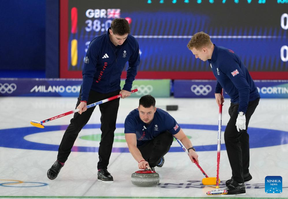 Hammy McMillan (C) of Britain competes during the curling men's gold medal game between Canada and Britain at the 2026 Milan-Cortina Winter Olympics in Cortina, Italy, Feb. 21, 2026. (Xinhua/Li Gang)