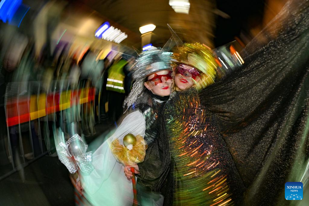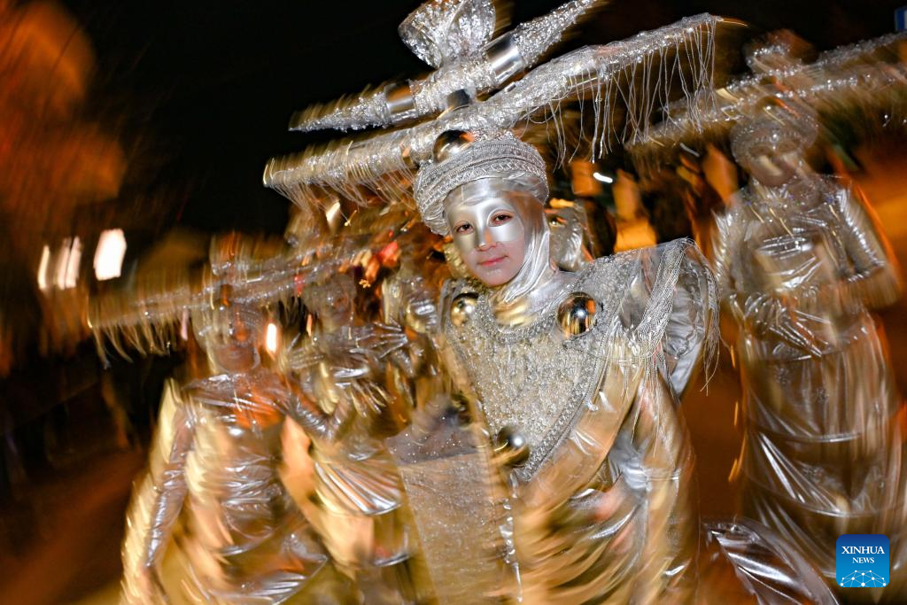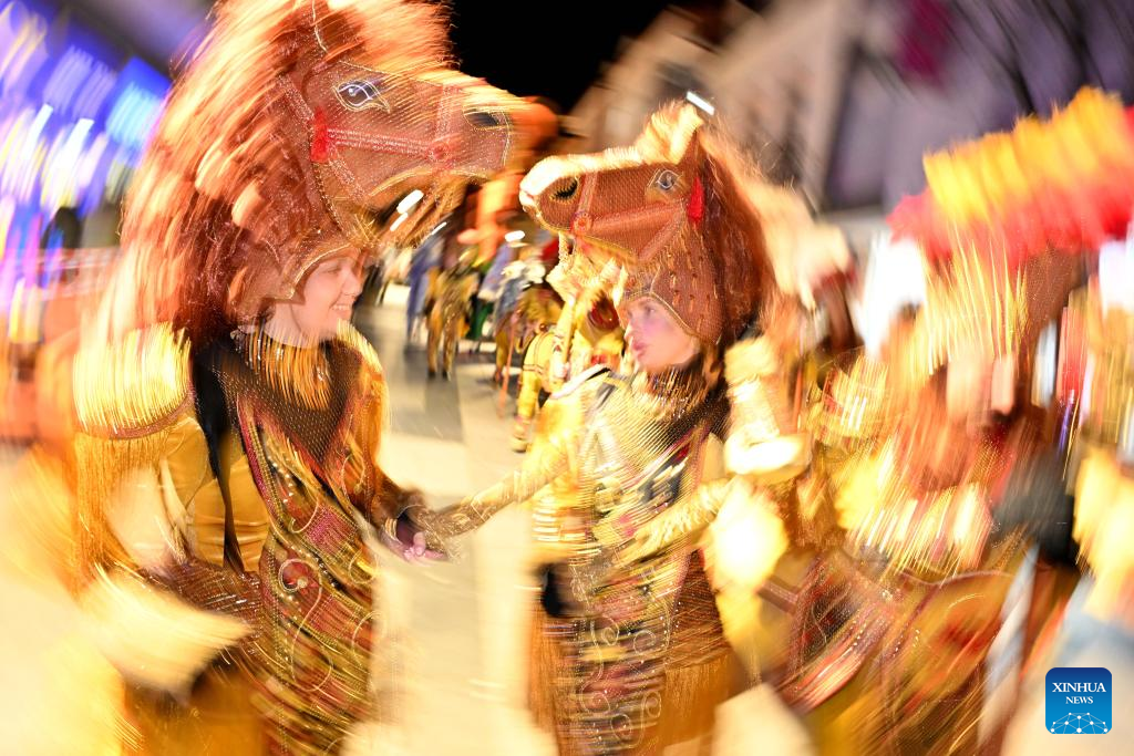 Costumed revelers perform in an evening carnival in Strumica, North Macedonia, Feb. 21, 2026. (Photo by Tomislav Georgiev/Xinhua)