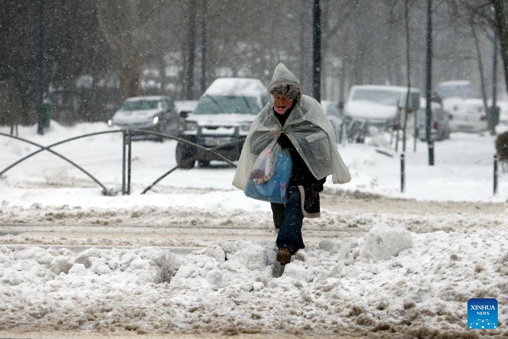 A woman walks amid snowfall on a snow-covered street in Bucharest, Romania, on Feb. 21, 2026. Heavy snow, strong winds and icy conditions on Saturday again affected roads, maritime ports and power supplies across southern and eastern Romania, according to authorities. (Photo by Cristian Cristel/Xinhua)