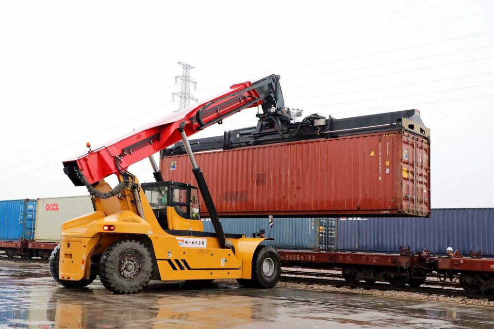 满载汽车配件的集装箱在株洲陆港被吊装上车。(国铁广州局供图)