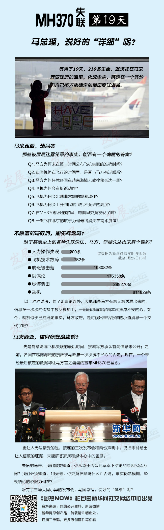 等待了19天,239條生命,就這樣在馬來西亞政府的嘴里,化成塵埃,落定在一個連他們自己都不能確定的南印度洋海域。事實仍然模糊,結論的說服力何在?馬國總理,你說好的“詳細”呢?