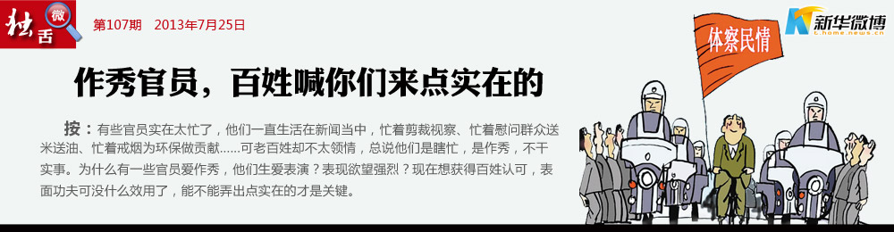 作秀為升遷 此刻正當(dāng)午,領(lǐng)導(dǎo)細(xì)揮鋤。記者勤拍照,忙煞眾下屬。隨從旁邊簇,人多造擁堵。官員忙下鄉(xiāng),鏡頭前擺譜。與農(nóng)同勞作,升遷好走路。想那雷政富,也曾載過(guò)樹(shù)。頭上是青天,腳下是黑土。干部莫作秀,好名留千古。