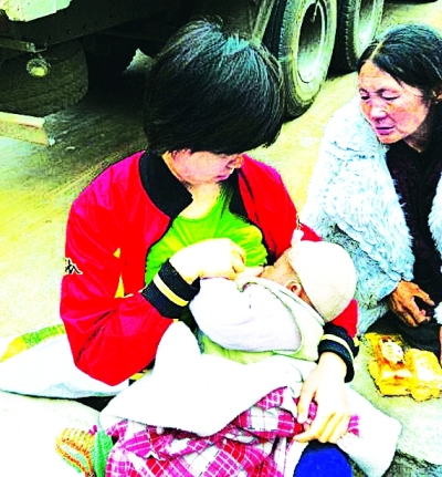 女志愿者為孤兒哺乳 網(wǎng)友劉守龍和朋友帶著救援物資去蘆山縣的途中,記錄了這感人的一幕。照片中哺乳的紅衣女子是成都趕來(lái)的志愿者。嬰兒的奶奶表示,四個(gè)月大的嬰兒已經(jīng)兩天沒(méi)有喝奶了,嬰兒的母親在地震中已被倒塌房屋壓死。紅衣女子得知后便把孩子抱來(lái)喂奶。
