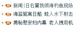 看看某浪網(wǎng)新聞的幾個標題。第一行,很氣憤;第2行左邊,心里舒服點;看到右邊,心里不禁激動了起來,速速點了進去,卻發(fā)現(xiàn)原來是標題黨!能不能說清楚啊?明明是實拍蛙人水下射擊訓練,你省去了幾個關鍵字,和前面的標題連到一起,我還以為和日本打起來了呢,嚴重傷害網(wǎng)友感情!
