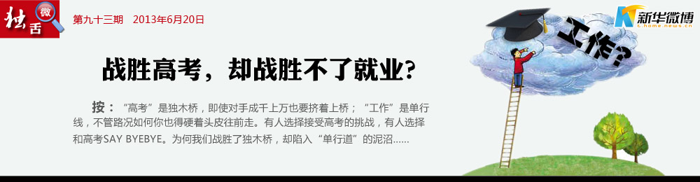 花費(fèi)了高昂的學(xué)習(xí)成本、浪費(fèi)了寶貴的年華、經(jīng)歷了非人的摧殘,結(jié)果戰(zhàn)勝了高考,卻陷入“就業(yè)難”的泥沼。當(dāng)很多大學(xué)生面臨畢業(yè)就失業(yè)、起薪比農(nóng)民工還低的時(shí)候,曾一直縈繞在耳邊的“高考成功、人生美滿”的話語,怎么變成了一記耳光、一個(gè)笑話?
