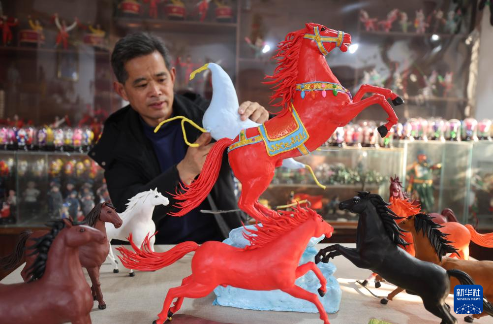 1月16日,在山东省临沂市沂南县红石寨非物质文化遗产博物馆,面塑艺人左安胜在创作面塑作品“赤马踏春”。
