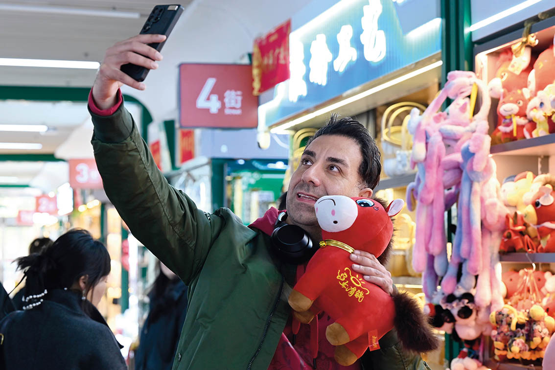 2026年1月12日,在浙江义乌市国际商贸城一区玩具销售区,来自芬兰的外商与“哭哭马”小马公仔玩具合影