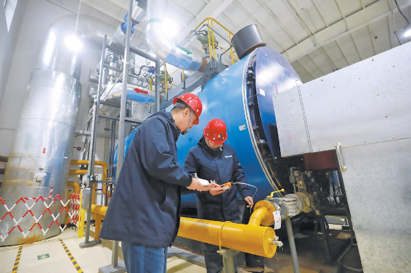 北京热力各项供热设备设施检修技改工作已进入冲刺阶段,图为工作人员检查嘉多丽园小区锅炉房设备。记者 甘南摄