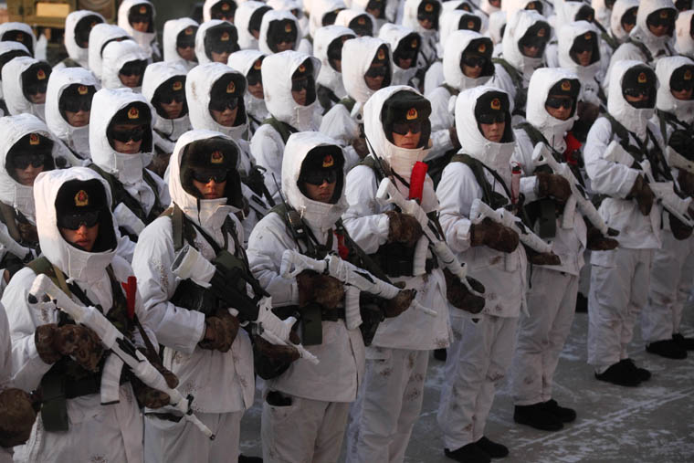 Soldiers wearing snow goggles get ready for the field drill. A border defense regiment with the Heilongjiang Provincial Military Area (PMA) of the PLA organized its officers and soldiers to conduct a field drill in a frigid environment of over 30 degrees below zero in Heihe, northeast China’s Heilongjiang Province, on January 20, 2016.