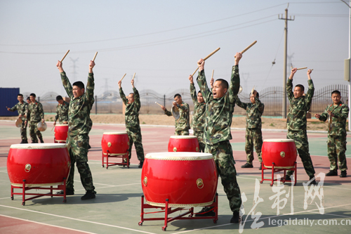 圖為隊(duì)員正在進(jìn)行威風(fēng)鑼鼓表演