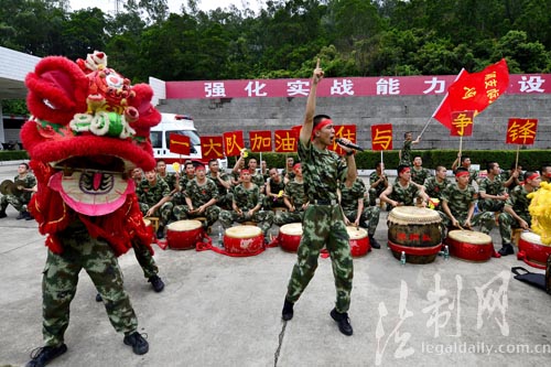 ????五月綠茵,激情無(wú)限。連日來(lái),每到下午,深圳市銀湖山邊防訓(xùn)練基地里總是人聲鼎沸,這是廣東邊防總隊(duì)機(jī)動(dòng)支隊(duì)“和諧杯”正在如火如荼進(jìn)行。與其它足球賽不一樣的是,別的比賽屬于場(chǎng)上22個(gè)人,而這里的比賽卻屬于每一個(gè)人。這個(gè)支隊(duì)將娛樂(lè)賽事當(dāng)成放松身心、提神聚氣之舉,在系列賽事中設(shè)置與比賽同等重要的拉拉隊(duì)比賽,要求全民參與,除了場(chǎng)上比賽,裁判員同時(shí)對(duì)每支拉拉隊(duì)進(jìn)行實(shí)時(shí)評(píng)分,此舉有效的提升全民參與熱情,處處展現(xiàn)凝神聚氣爭(zhēng)第一的鮮活局面。