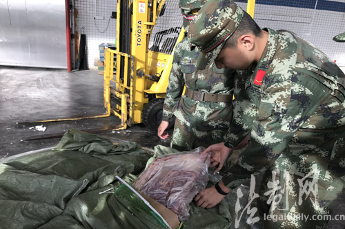 ????這次我們要為邊防官兵和執(zhí)法部門點贊,他們守護了我們舌尖上的安全!6月12日,在廣東省打私辦“春雷行動”統(tǒng)一部署下,東莞市打私辦、廣東邊防總隊東莞邊防支隊、東莞市檢驗檢疫局、中堂鎮(zhèn)政府等多部門聯(lián)合開展清查行動,成功在東莞中堂鎮(zhèn)一倉儲物流公司廠區(qū)內查獲一批涉嫌非法走私凍品。