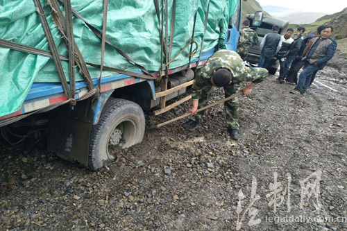 ????連日來,受強(qiáng)降雨天氣影響,通往西藏山南市錯(cuò)那縣卡達(dá)鄉(xiāng)道路因山體塌方和泥石流損毀嚴(yán)重,7月23日中午12時(shí),西藏邊防總隊(duì)山南邊防支隊(duì)卡達(dá)邊防派出所接轄區(qū)居民電話報(bào)警稱:商店運(yùn)貨貨車在返回卡達(dá)鄉(xiāng)途中陷入泥潭,請(qǐng)求派出所救援。接到消息后,該所迅速組織官兵趕往現(xiàn)場,并持續(xù)關(guān)注道路情況和受困狀況。到達(dá)現(xiàn)場后,邊防官兵立即展開救援,用十字鎬挖、用手刨、用人推,經(jīng)過2個(gè)小時(shí)的不懈努力,最終成功把陷入泥坑的貨車?yán)?。救援結(jié)束后,邊防官兵就近取材把泥坑填平,并設(shè)立警示標(biāo)志,確保后續(xù)車輛順利通過?,F(xiàn)場無人員受傷,車輛完好。