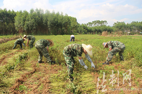 圖為貴港邊檢站官兵與農(nóng)零大叔一起頂著烈日在花生田里拔花生