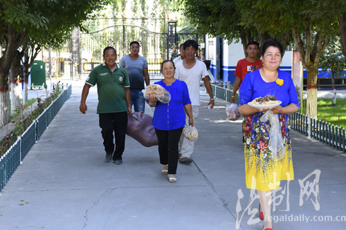 ????“你們平時執(zhí)勤都那么忙,每次叫你們?nèi)ノ曳孔映灶D飯都不去,現(xiàn)在總可以嘗一嘗我親手做的馓子了吧”帕提曼手拿著一把馓子遞給了桌旁的民警小王,這是發(fā)生在2017年7月26日三道河邊防派出所里的一幕,為了慶祝即將到來的建軍90周年,帕提曼與霍城縣三道河鄉(xiāng)五隊的村民帶著一些自家的東西去慰問邊防派出所的官兵,他們都有一個特殊的身份——新疆邊防總隊伊犁邊防支隊三道河邊防派出所官兵們的結(jié)對親戚們。