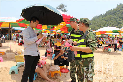 ????在天氣越來越熱的夏季,“海邊游”受到越來越多游客的追捧和青睞。尤其正值暑期,許多游客選擇帶小孩到海邊避暑。為使游客玩得舒心和盡興,廣西公安邊防總隊(duì)防城港邊防支隊(duì)江山邊防派出所針對夏季旅游景點(diǎn)溺水、小孩走失等易發(fā)多發(fā)的實(shí)際,組織官兵深入轄區(qū)景點(diǎn)開展安全宣傳活動。
