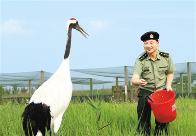 ????駐守在這里的邊防官兵主動(dòng)承擔(dān)起守護(hù)濕地生態(tài)、保護(hù)野生動(dòng)物的使命,他們?nèi)找勾┧笱策壴趶V袤的濕地。僅今年以來(lái),該所依托“警民義務(wù)護(hù)鳥(niǎo)隊(duì)”、“護(hù)鳥(niǎo)熱線(xiàn)”等平臺(tái),組織官兵巡邏踏查保護(hù)區(qū)核心區(qū)域120余次,定期向丹頂鶴等各類(lèi)候鳥(niǎo)投放玉米等飼料。同時(shí),該所深入轄區(qū)向村民宣傳《野生動(dòng)物保護(hù)法》,讓這片土地真正成為候鳥(niǎo)的一片樂(lè)土,獲得了保護(hù)區(qū)、駐地政府以及當(dāng)?shù)匕傩盏馁澴u(yù),邊防官兵們被親切地稱(chēng)作候鳥(niǎo)“守護(hù)神”。圖為官兵喂食丹頂鶴。(童瑞金 耿建平)