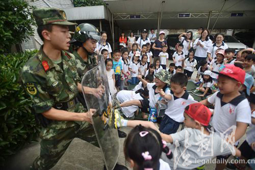 ????8月7日上午,江蘇邊防總隊(duì)揚(yáng)州邊檢站營區(qū)內(nèi)傳出一陣陣稚嫩的驚嘆聲和歡呼聲,36名東方劍橋外語幼兒園學(xué)生及家長(zhǎng)一同走進(jìn)邊防部隊(duì)營區(qū),與武警叔叔共同感受部隊(duì)的真實(shí)生活。