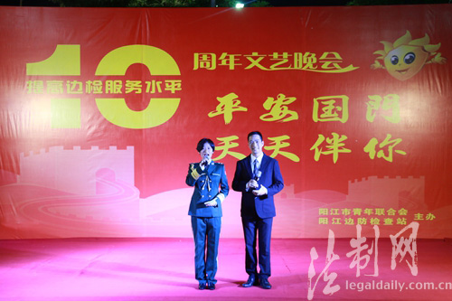????8月18日晚,廣東邊防總隊(duì)陽江邊檢站官兵與陽江青年聯(lián)合會共同舉辦了一場“平安國門,天天伴你”文藝晚會,演繹了軍民魚水情深。晚會邀請了陽江市團(tuán)委、口岸聯(lián)檢單位、駐地企業(yè)、駐地群眾代表約200余人。