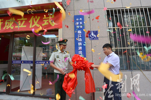 圖為丹東市公安邊防支隊領導同丹東市振興區(qū)政府領導共同為臨江邊防派出所揭彩