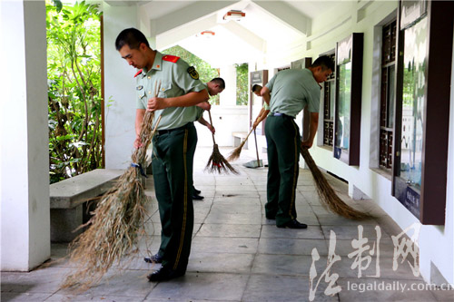 圖為臨退老兵到駐地社區(qū)公共場(chǎng)所義務(wù)勞動(dòng)