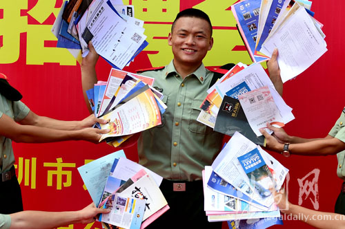 圖為老兵像展示榮譽一樣展示收獲的崗位招聘資料