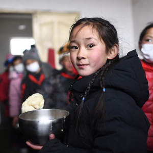 3月16日,在索加鄉(xiāng)寄宿小學食堂,白瑪措毛(前)和同學們一起打飯。