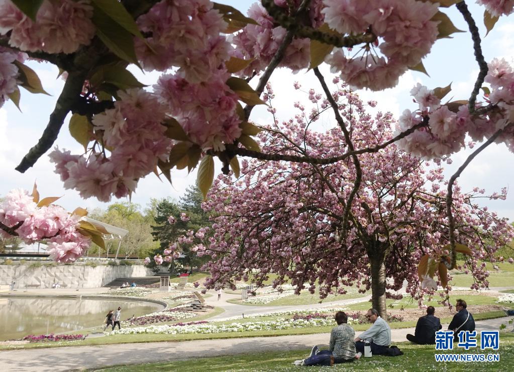 4月21日,人們?cè)诜▏?guó)巴黎一處公園的櫻花樹下休閑。