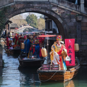 2月21日在乌镇景区内拍摄的福寿禧财水上巡游。