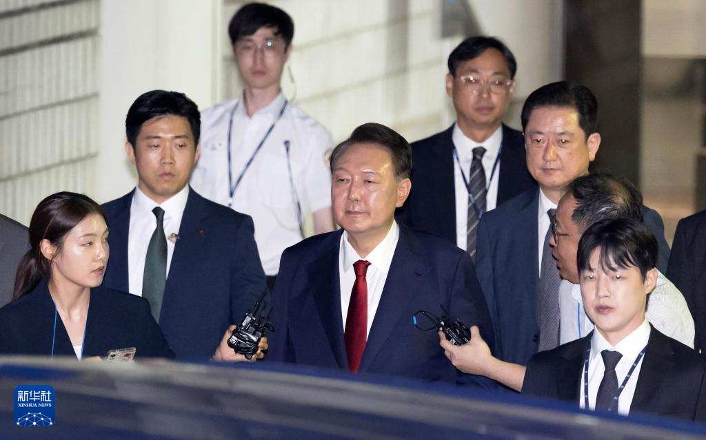 这是2025年7月9日晚,韩国前总统尹锡悦接受讯问后走出首尔中央地方法院(资料照片)。