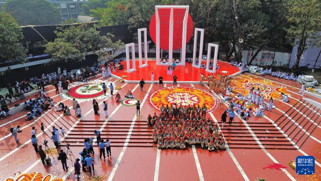2月21日,在孟加拉国首都达卡的语言烈士纪念碑前,人们参加国际母语日纪念活动(无人机照片)。