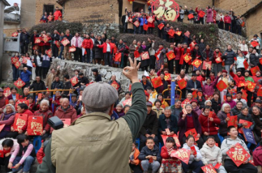 2月13日,73岁的摄影师徐乐安在拍摄完成后用手势向村民示意。徐乐安已连续8年为东山村民拍摄“全村福”。