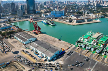 这是2月21日在海南省海口市秀英港拍摄的等待驶入客滚船的车辆。