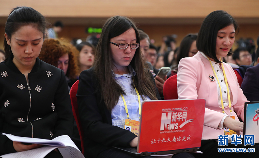 10月26日上午10:00,中國共產(chǎn)黨第十九次全國代表大會新聞發(fā)言人在梅地亞賓館二層新聞發(fā)布廳召開專題新聞發(fā)布會,請有關(guān)方面負(fù)責(zé)人解讀十九大報告,并回答記者關(guān)心的問題。圖為現(xiàn)場媒體記者。新華網(wǎng)?翟子赫 攝
