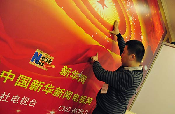 3月1日,新華網兩會報道人員正在布置工作間。第十一屆全國人民代表大會第四次會議、全國政協(xié)十一屆四次會議即將開幕。