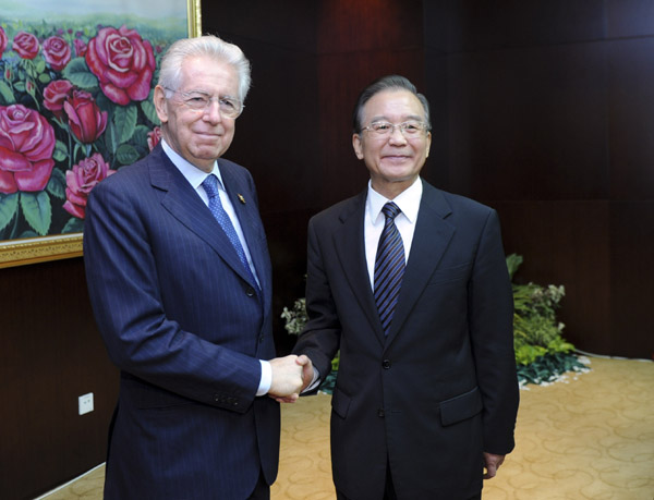 ????在會(huì)見蒙蒂時(shí),溫家寶表示,一段時(shí)間以來,歐盟采取了若干重大舉措應(yīng)對(duì)歐債問題,意大利積極推進(jìn)財(cái)政改革和經(jīng)濟(jì)振興計(jì)劃,這些都讓歐洲和國(guó)際社會(huì)看到了希望,增添了信心。中方支持歐方作出更有成效的努力,倡議中歐探討在經(jīng)貿(mào)、投資、基礎(chǔ)設(shè)施、金融、高科技等領(lǐng)域開展大規(guī)模合作。意大利有燦爛的文化和很強(qiáng)的創(chuàng)新能力,在歐盟中發(fā)揮著重要影響。中方愿與意方加強(qiáng)協(xié)調(diào)合作,繼續(xù)應(yīng)對(duì)國(guó)際金融危機(jī),推動(dòng)中意、中歐關(guān)系取得更大進(jìn)展。