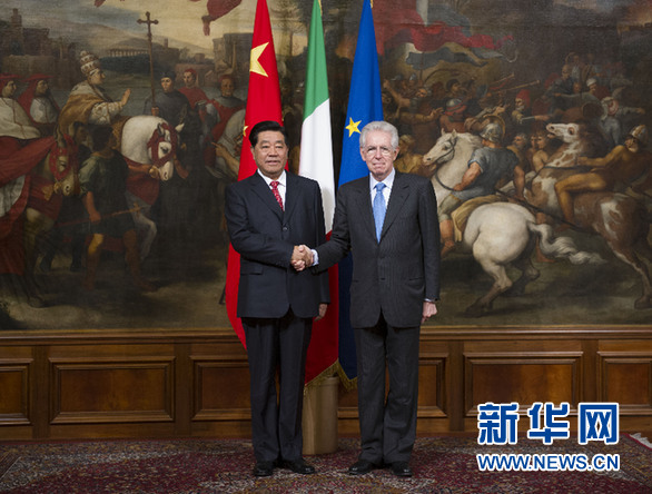 ????當?shù)貢r間11月28日,全國政協(xié)主席賈慶林在羅馬會見意大利總理蒙蒂。(來源:新華社記者 李學(xué)仁 攝)