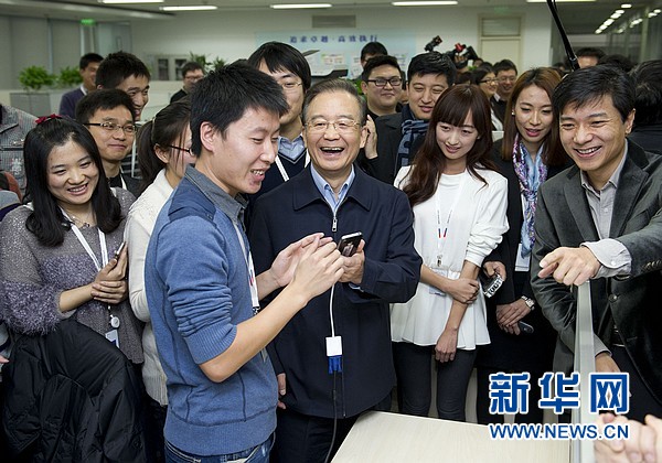 ??? 12月13日,國(guó)務(wù)院總理溫家寶到北京中關(guān)村考察并與部分企業(yè)負(fù)責(zé)人座談。這是溫家寶在百度公司考察時(shí),試用手機(jī)語(yǔ)音搜索。 新華社記者黃敬文 攝