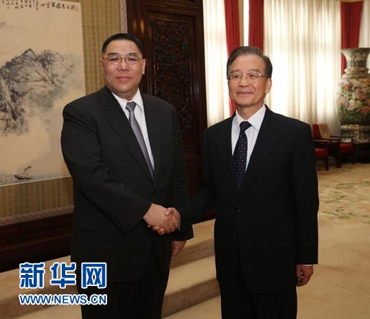 ??? 12月21日,中國國務(wù)院總理溫家寶在北京中南海會(huì)見來京述職的澳門特別行政區(qū)行政長官崔世安。 新華社記者 劉衛(wèi)兵 攝