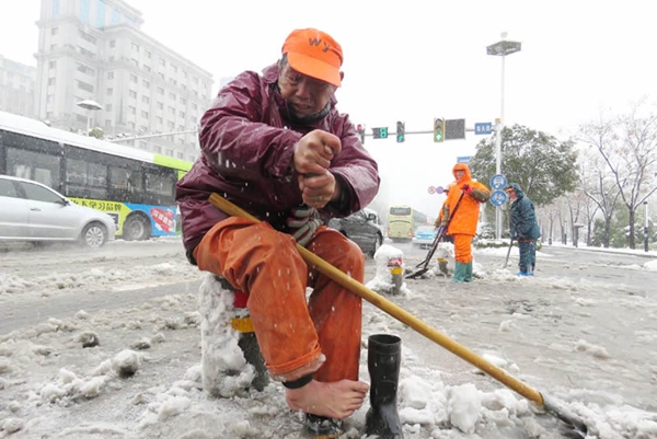 通訊電纜被壓落導(dǎo)致交通癱瘓 執(zhí)勤協(xié)警爬上公交車頂 用雙手托舉電纜線10多分鐘 城管 暖心! 南京城管掃雪打通道路 兩歲小女孩跑過來說“謝謝叔叔” 環(huán)衛(wèi)工人 擰干濕透的襪子
