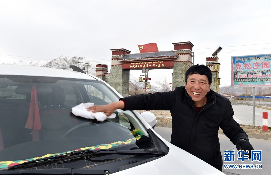 3月27日,克松村致富能手達(dá)瓦準(zhǔn)備開車出行。 新華社記者覺(jué)果攝