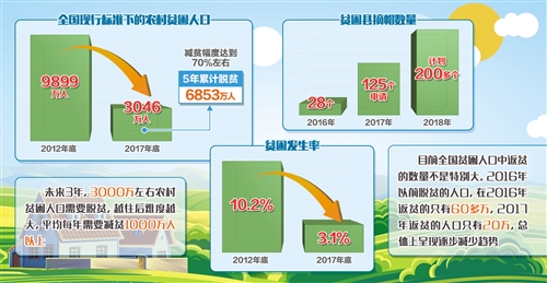 在以習(xí)近平同志為核心的黨中央堅(jiān)強(qiáng)領(lǐng)導(dǎo)下,脫貧攻堅(jiān)力度之大、規(guī)模之廣、影響之深前所未有。經(jīng)過幾年的努力,脫貧攻堅(jiān)取得決定性進(jìn)展:全國現(xiàn)行標(biāo)準(zhǔn)下的農(nóng)村貧困人口由2012年底的9899萬人,減少到2017年底的3046萬人,5年累計(jì)脫貧6853萬人,減貧幅度達(dá)到70%左右。貧困發(fā)生率由2012年底的10.2%下降到2017年底的3.1%。貧困縣數(shù)量實(shí)現(xiàn)了首次減少,2016年有28個(gè)貧困縣脫貧摘帽,2017年有125個(gè)貧困縣申請(qǐng)摘帽,今年計(jì)劃200多個(gè)縣摘帽,解決區(qū)域性整體貧困邁出堅(jiān)實(shí)步伐。貧困地區(qū)群眾生產(chǎn)生活條件明顯改善,貧困群眾收入水平明顯提高、獲得感明顯增強(qiáng)。