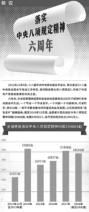 六年來,中央紀(jì)委國家監(jiān)委和各級紀(jì)檢監(jiān)察機(jī)關(guān)以釘釘子精神打好作風(fēng)建設(shè)持久戰(zhàn),一個(gè)節(jié)點(diǎn)一個(gè)節(jié)點(diǎn)堅(jiān)守,一個(gè)問題一個(gè)問題解決,盯緊盯牢、持之以恒,一刻不停歇地推動作風(fēng)建設(shè)向縱深發(fā)展,以實(shí)際成效將“金色名片”越擦越亮。截至2018年10月底,全國累計(jì)查處違反中央八項(xiàng)規(guī)定精神問題254808起,處理349552人,給予黨紀(jì)政務(wù)處分206428人。